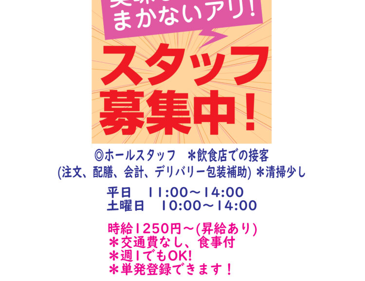 【アルバイト募集のおしらせ】 ◎ホールスタッフ *飲食店での接客 (注文、配膳、会計、デリバリー包装補助)